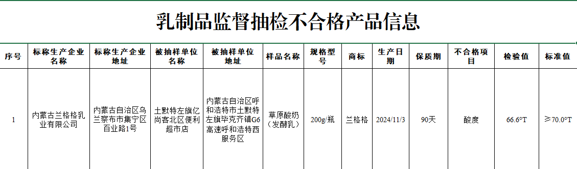 一面“宽度一公分,深度十公里”的深耕标语,一面却正在国度抽检中交出酸度不脚的答卷。兰格格的高速扩张之,正出其难以掩饰的质量裂痕。近日,市场监管总局的一纸传递,让兰格格乳业无限公司的草原酸奶登上了不及格名单。一款出产日期为2024年11月3日的200克瓶拆发酵乳,酸度检测值仅为66。6°T,低于国度尺度的70。0°T。酸度不只是酸奶风味的目标,更是其抵当杂菌污染能力的环节。这一成果,无疑给这家以“草原酸奶”为焦点卖点的品牌敲响了警钟。近日,市场监管总局办公厅发布食物抽检不及格环境的传递,1批次标称兰格格乳业无限公司出产的草原酸奶(发酵乳),被检出酸度不达标。据悉,该批次不及格产物于2024年11月3日出产,规格为200g/瓶,保质期90天。正在其保质期内进行的抽检显示,其酸度查验成果为66。6°T,而根据国度尺度,该项目标不得低于70。0°T。